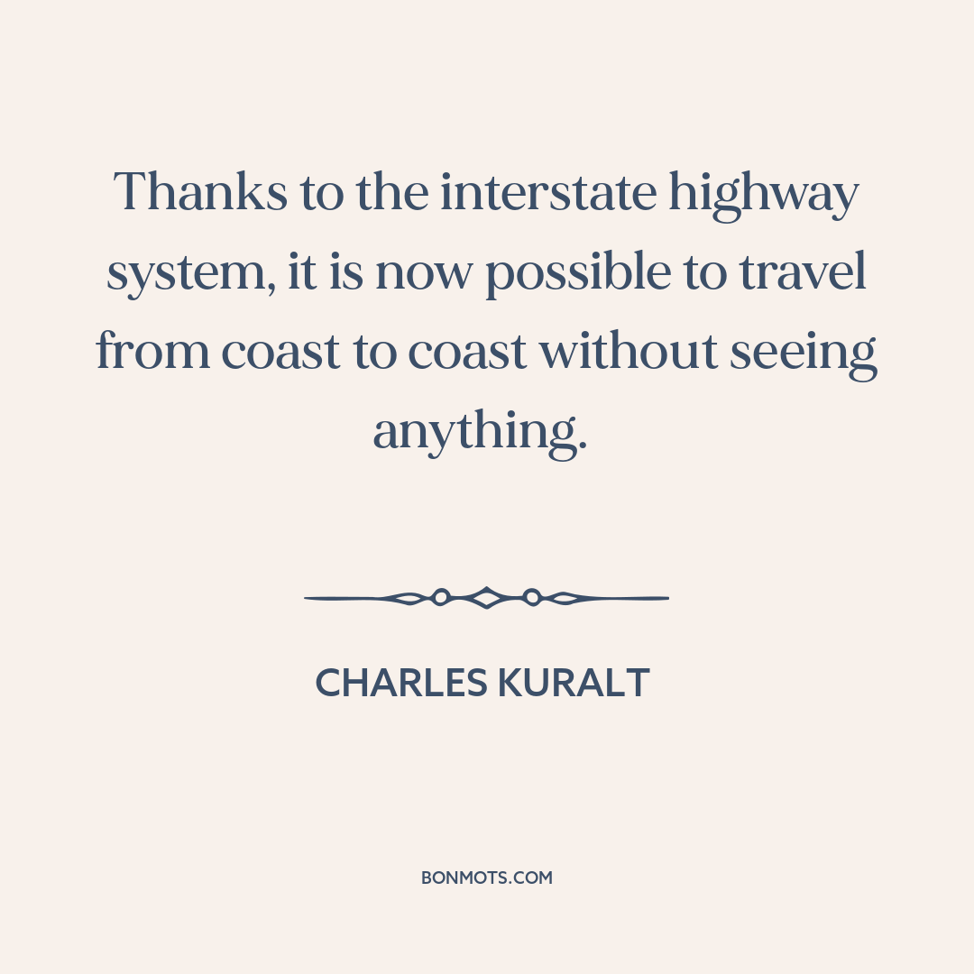 Thanks to the interstate highway system, it is now possible to travel from coast to coast without seeing anything.