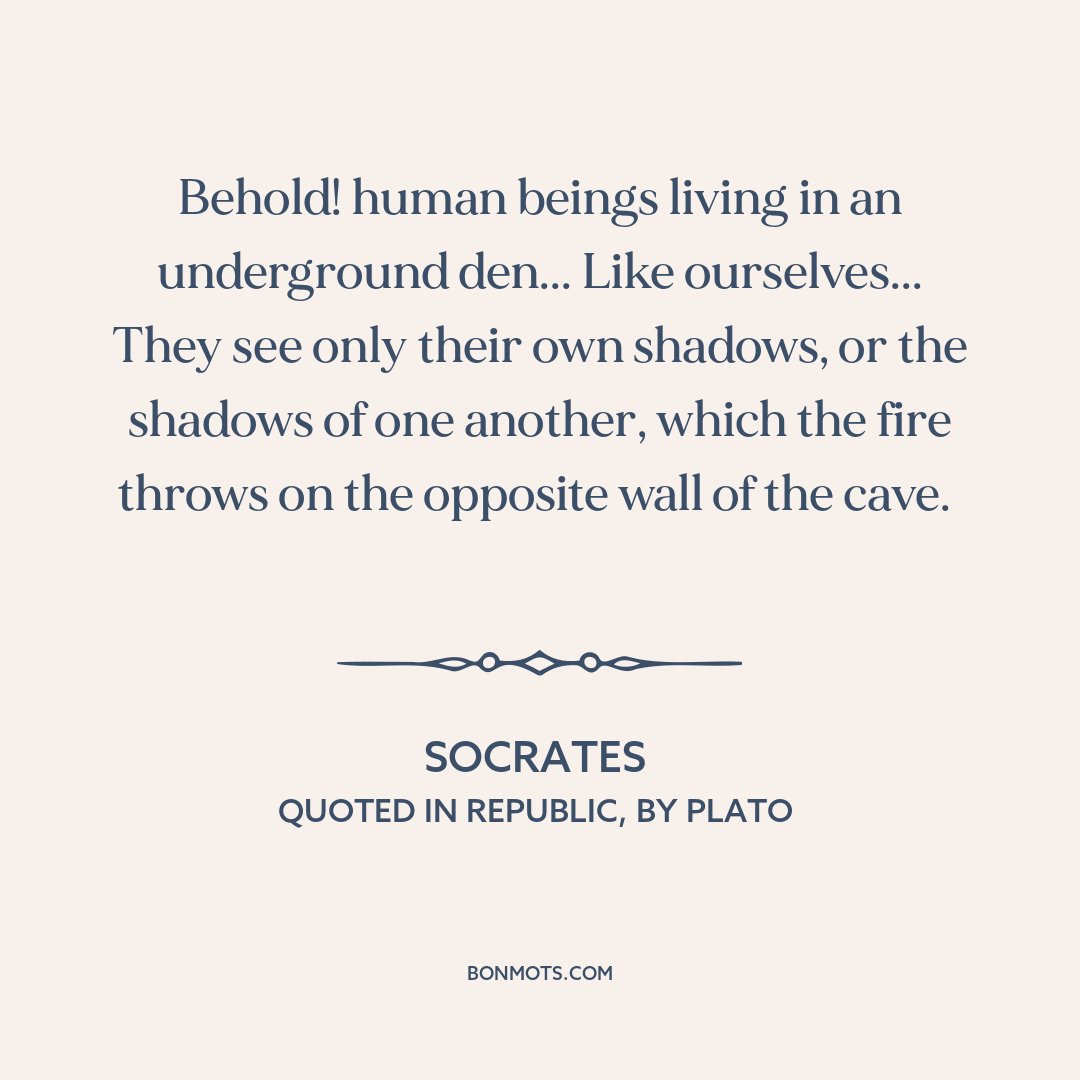 Behold! human beings living in an underground den... Like ourselves... They see only their own shadows, or the shadows of one another, which the fire throws on the opposite wall of the cave.
