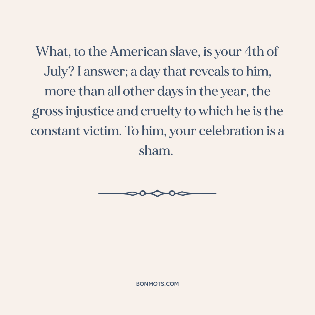 What, to the American slave, is your 4th of July? I answer; a day that reveals to him, more than all other days in the year, the gross injustice and cruelty to which he is the constant victim. To him, your celebration is a sham.