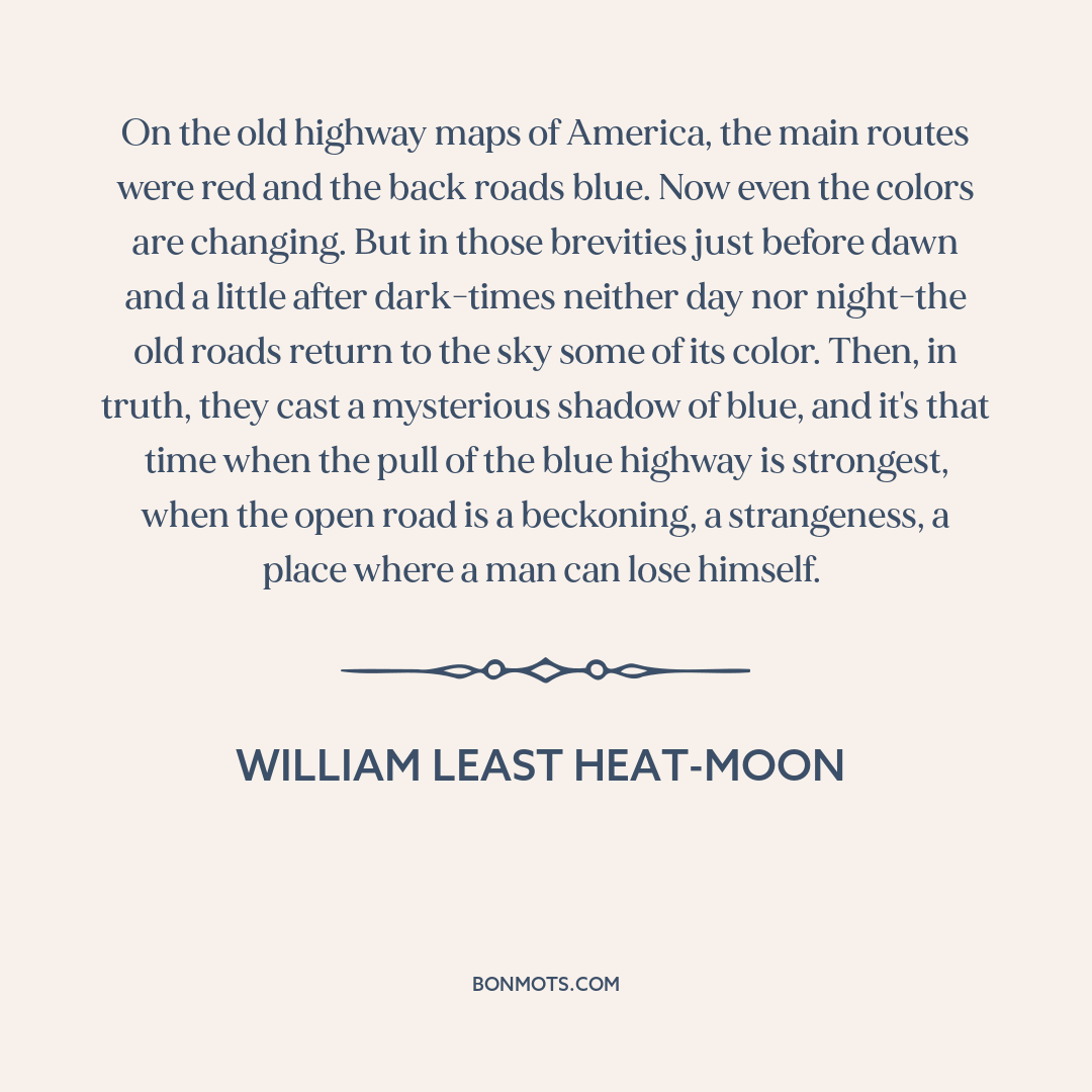 On the old highway maps of America, the main routes were red and the back roads blue. Now even the colors are changing. But in those brevities just before dawn and a little after dark-times neither day nor night-the old roads return to the sky some of its color. Then, in truth, they cast a mysterious shadow of blue, and it's that time when the pull of the blue highway is strongest, when the open road is a beckoning, a strangeness, a place where a man can lose himself.