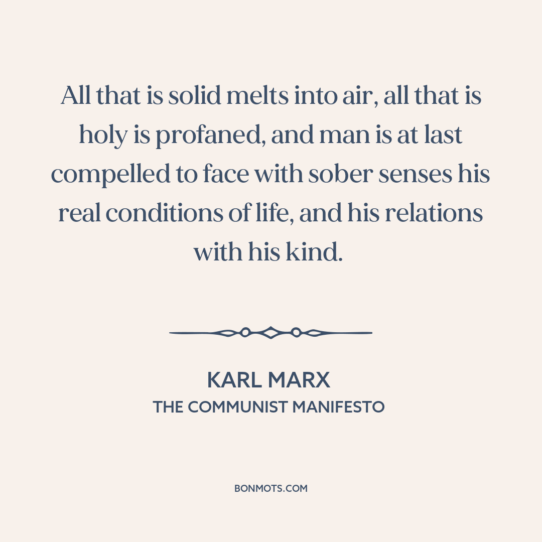 All that is solid melts into air, all that is holy is profaned, and man is at last compelled to face with sober senses his real conditions of life, and his relations with his kind.