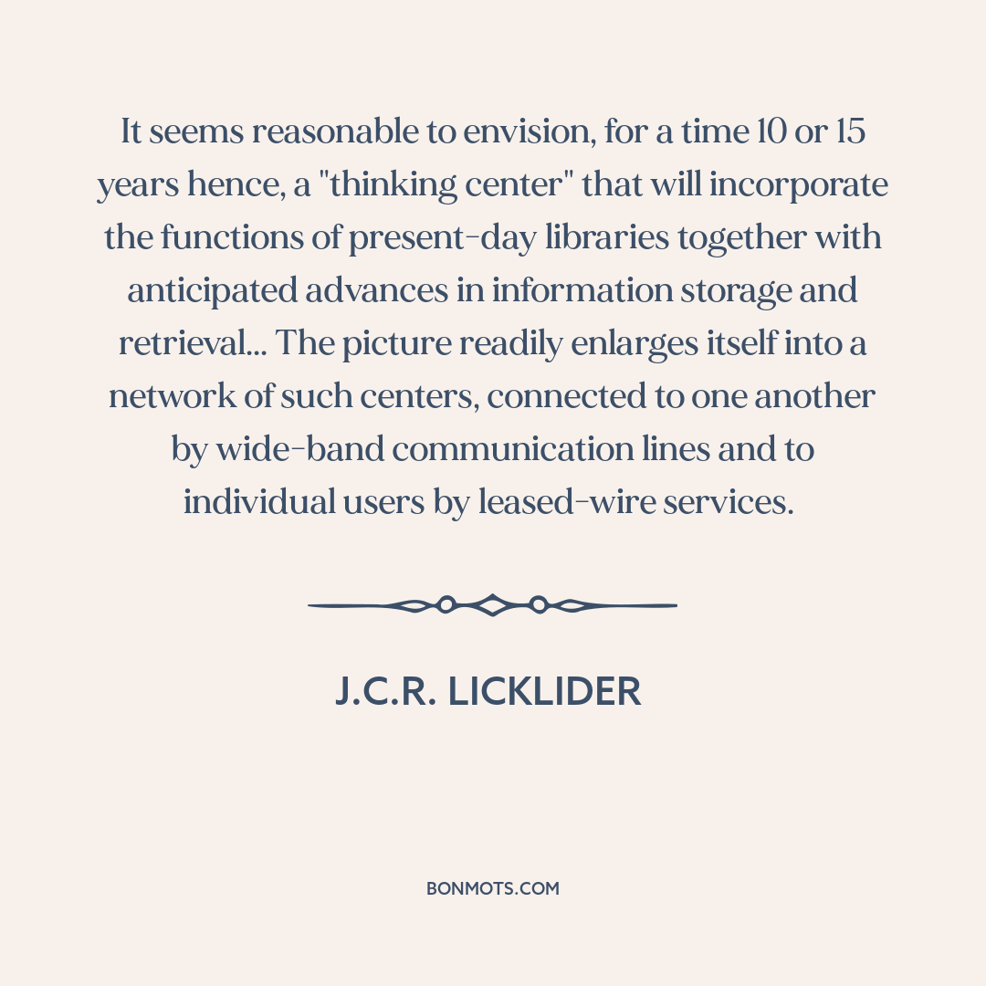 It seems reasonable to envision, for a time 10 or 15 years hence, a "thinking center" that will incorporate the functions of present-day libraries together with anticipated advances in information storage and retrieval... The picture readily enlarges itself into a network of such centers, connected to one another by wide-band communication lines and to individual users by leased-wire services.