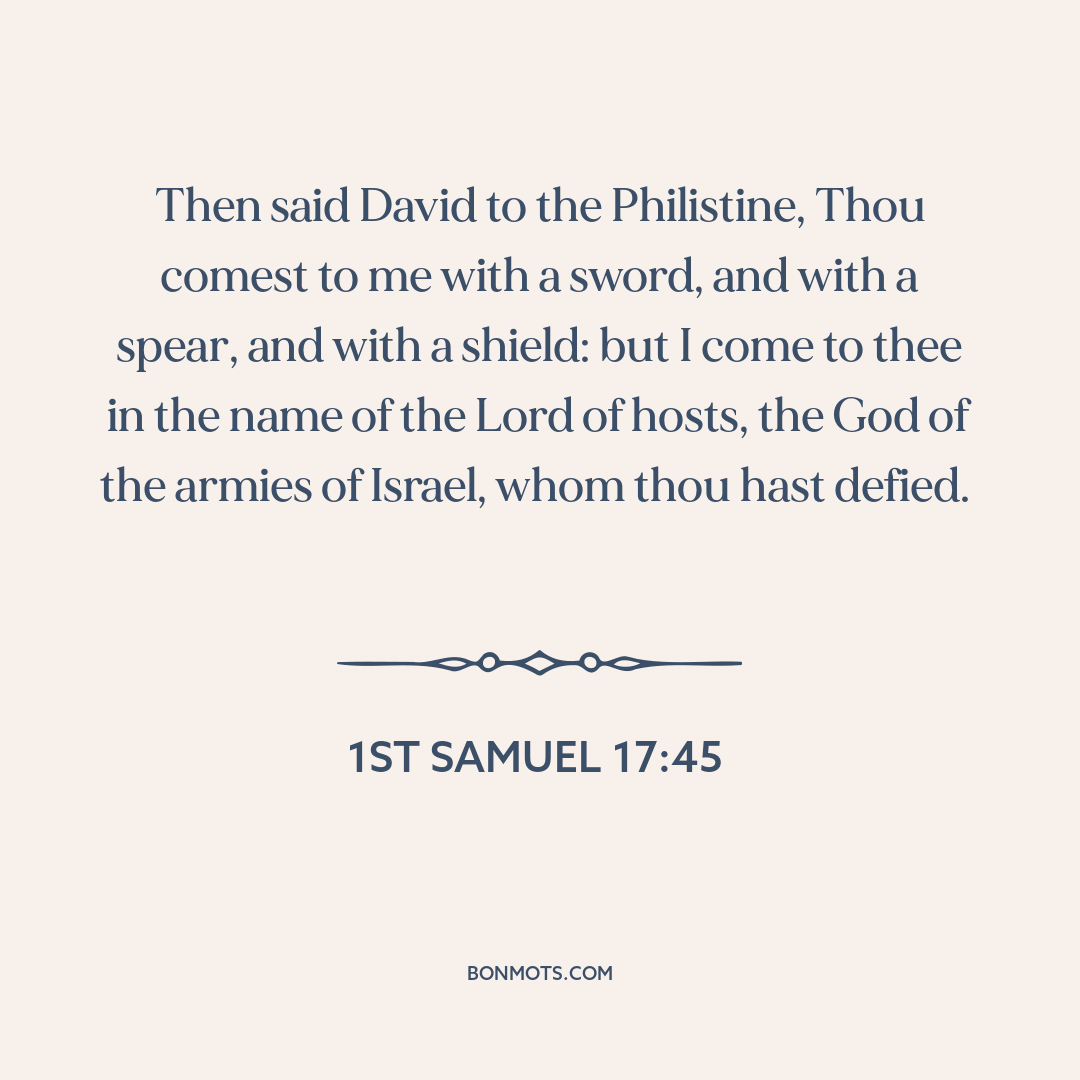 וַיֹּ֤אמֶר דָּוִד֙ אֶל־הַפְּלִשְׁתִּ֔י אַתָּה֙ בָּ֣א אֵלַ֔י בְּחֶ֖רֶב וּבַחֲנִ֣ית וּבְכִידֹ֑ון וְאָנֹכִ֣י בָֽא־אֵלֶ֗יךָ בְּשֵׁם֙ יְהוָ֣ה צְבָאֹ֔ות אֱלֹהֵ֛י מַעַרְכֹ֥ות יִשְׂרָאֵ֖ל אֲשֶׁ֥ר חֵרַֽפְתָּ