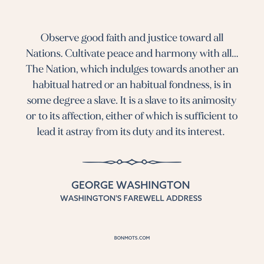 Observe good faith and justice toward all Nations. Cultivate peace and harmony with all... The Nation, which indulges towards another an habitual hatred or an habitual fondness, is in some degree a slave. It is a slave to its animosity or to its affection, either of which is sufficient to lead it astray from its duty and its interest.
