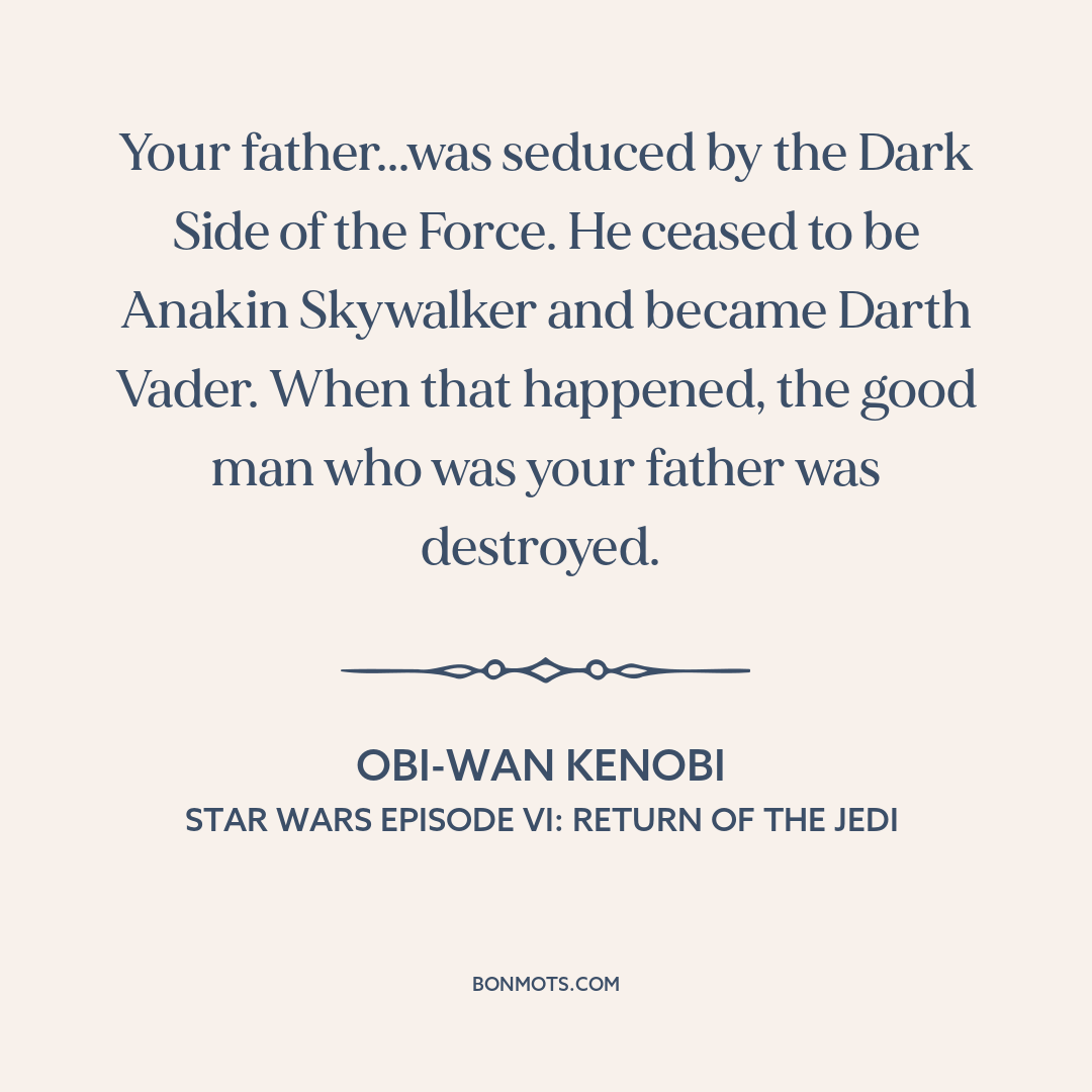 Your father...was seduced by the Dark Side of the Force. He ceased to be Anakin Skywalker and became Darth Vader. When that happened, the good man who was your father was destroyed.