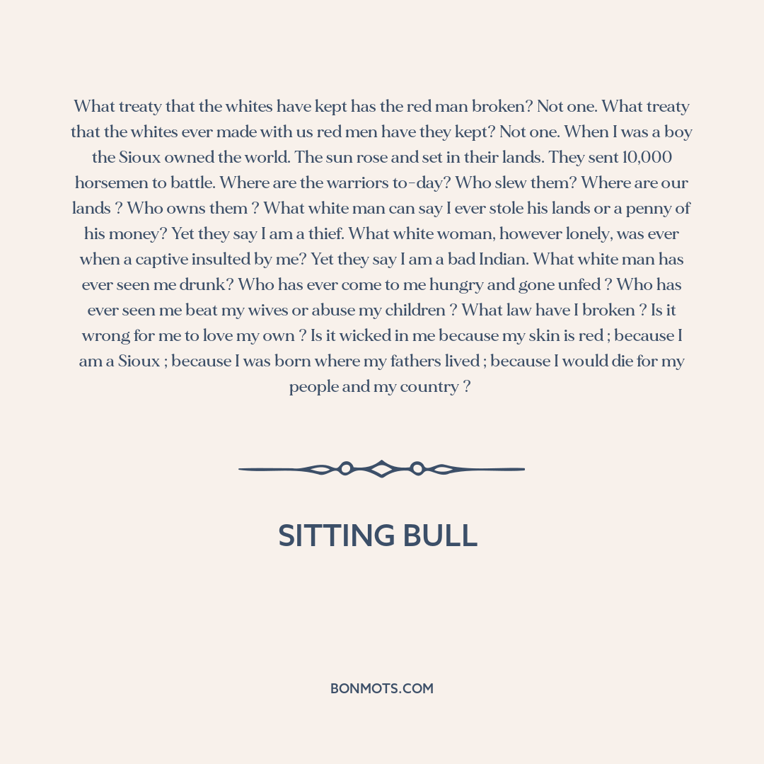 What treaty that the whites have kept has the red man broken? Not one. What treaty that the whites ever made with us red men have they kept? Not one. When I was a boy the Sioux owned the world. The sun rose and set in their lands. They sent 10,000 horsemen to battle. Where are the warriors to-day? Who slew them? Where are our lands ? Who owns them ? What white man can say I ever stole his lands or a penny of his money? Yet they say I am a thief. What white woman, however lonely, was ever when a captive insulted by me? Yet they say I am a bad Indian. What white man has ever seen me drunk? Who has ever come to me hungry and gone unfed ? Who has ever seen me beat my wives or abuse my children ? What law have I broken ? Is it wrong for me to love my own ? Is it wicked in me because my skin is red ; because I am a Sioux ; because I was born where my fathers lived ; because I would die for my people and my country ?