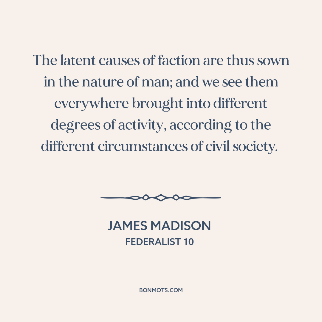The latent causes of faction are thus sown in the nature of man; and we see them everywhere brought into different degrees of activity, according to the different circumstances of civil society.