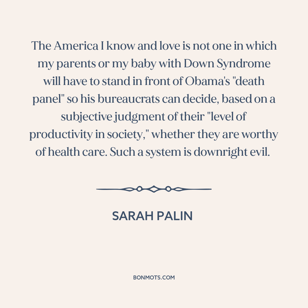 The America I know and love is not one in which my parents or my baby with Down Syndrome will have to stand in front of Obama's "death panel" so his bureaucrats can decide, based on a subjective judgment of their "level of productivity in society," whether they are worthy of health care. Such a system is downright evil.