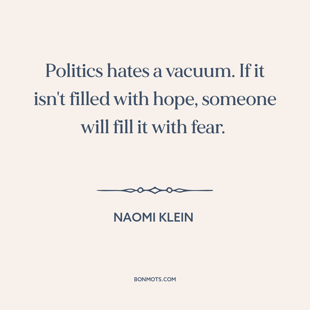 Politics hates a vacuum. If it isn't filled with hope, someone will fill it with fear.