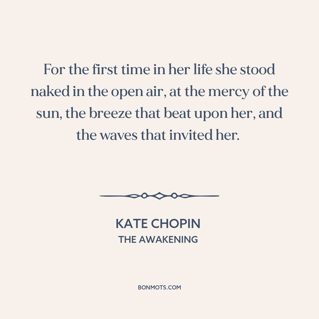 For the first time in her life she stood naked in the open air, at the mercy of the sun, the breeze that beat upon her, and the waves that invited her.
