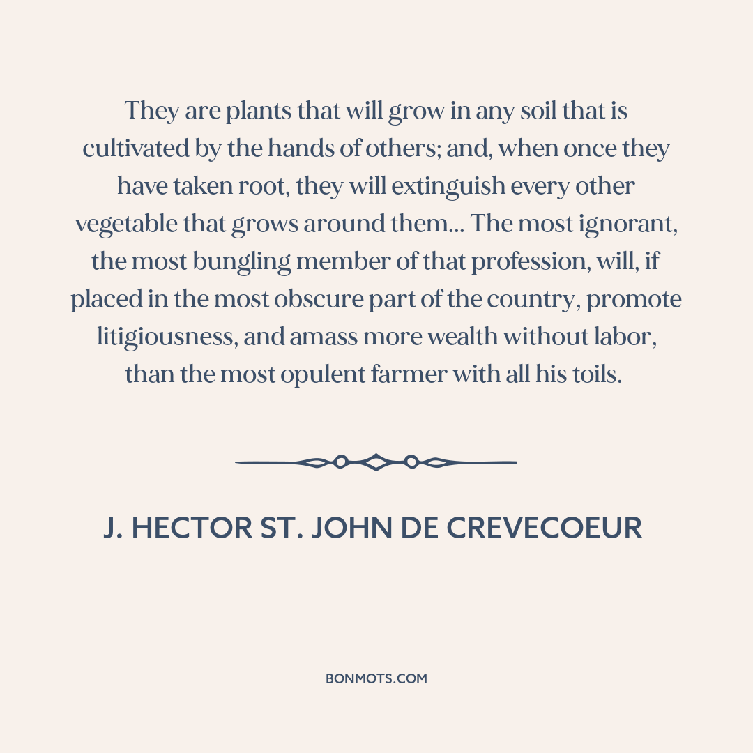 They are plants that will grow in any soil that is cultivated by the hands of others; and, when once they have taken root, they will extinguish every other vegetable that grows around them... The most ignorant, the most bungling member of that profession, will, if placed in the most obscure part of the country, promote litigiousness, and amass more wealth without labor, than the most opulent farmer with all his toils.