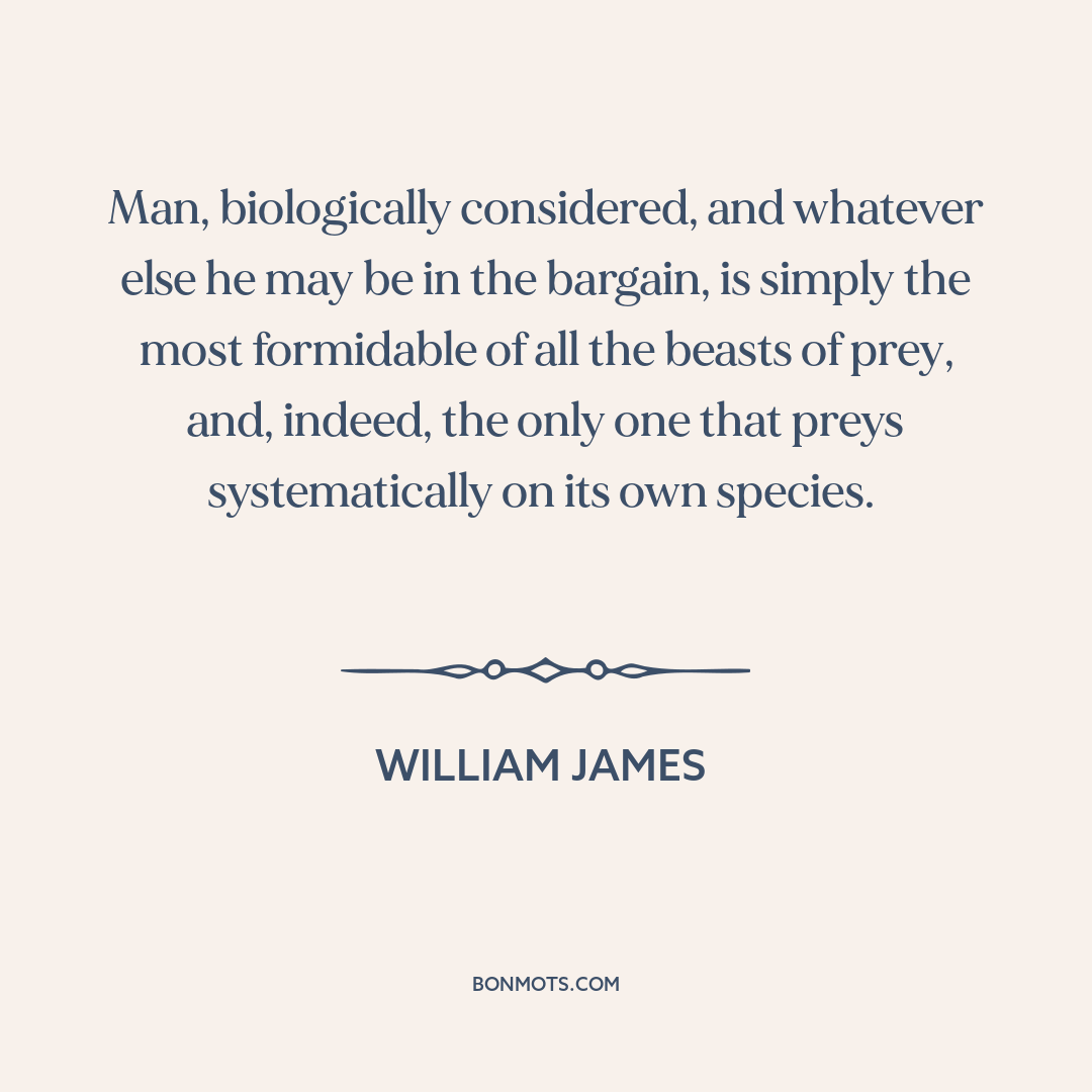 Man, biologically considered, and whatever else he may be in the bargain, is simply the most formidable of all the beasts of prey, and, indeed, the only one that preys systematically on its own species.
