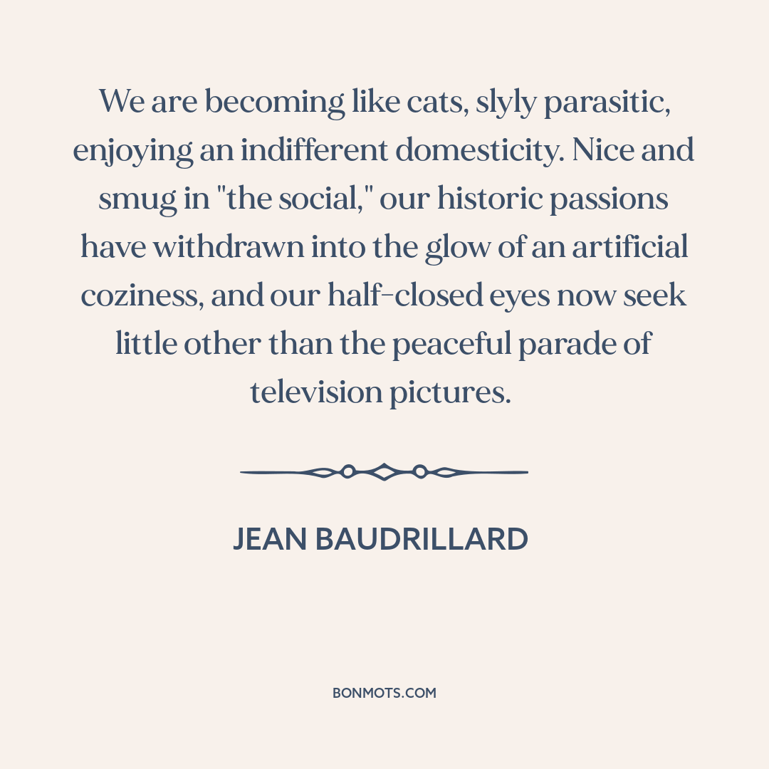 We are becoming like cats, slyly parasitic, enjoying an indifferent domesticity. Nice and smug in "the social," our historic passions have withdrawn into the glow of an artificial coziness, and our half-closed eyes now seek little other than the peaceful parade of television pictures.