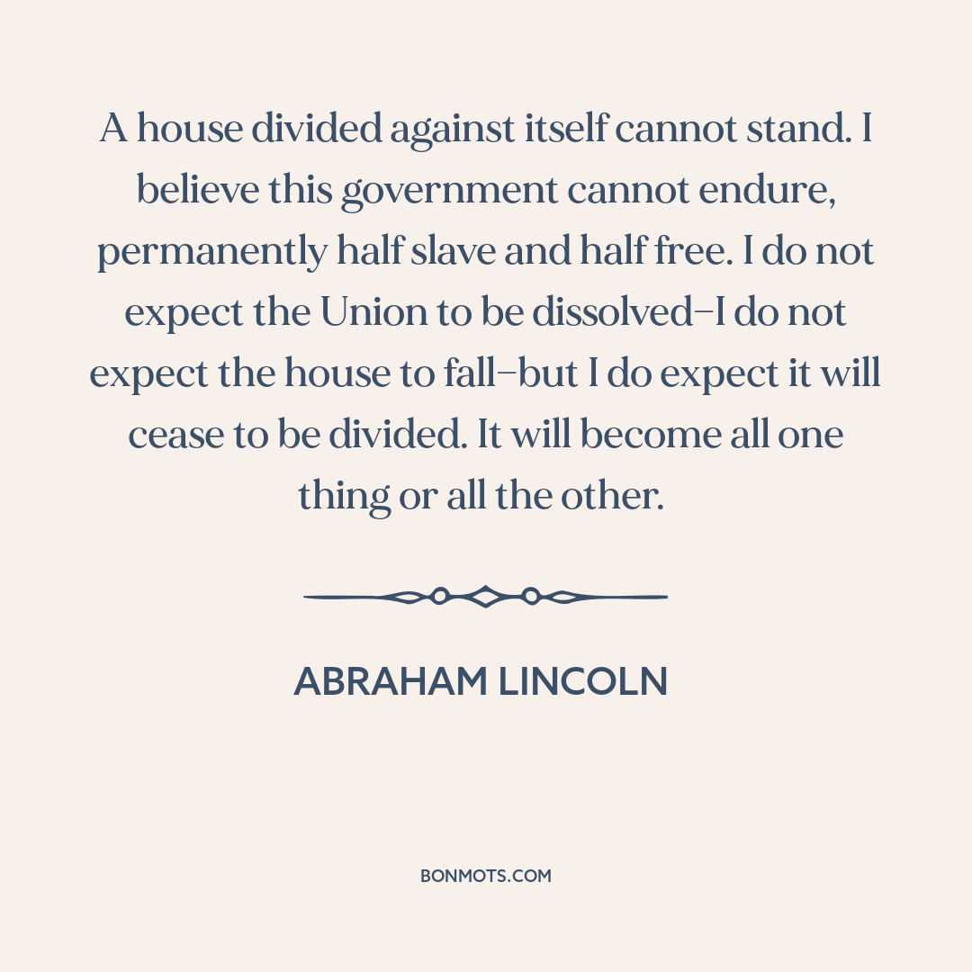 A house divided against itself cannot stand. I believe this government cannot endure, permanently half slave and half free. I do not expect the Union to be dissolved—I do not expect the house to fall—but I do expect it will cease to be divided. It will become all one thing or all the other.