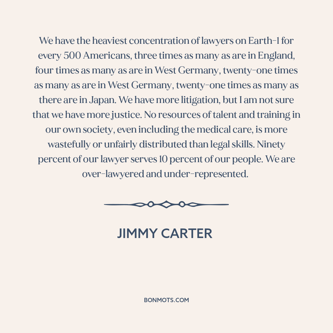 We have the heaviest concentration of lawyers on Earth-1 for every 500 Americans, three times as many as are in England, four times as many as are in West Germany, twenty-one times as many as are in West Germany, twenty-one times as many as there are in Japan. We have more litigation, but I am not sure that we have more justice. No resources of talent and training in our own society, even including the medical care, is more wastefully or unfairly distributed than legal skills. Ninety percent of our lawyer serves 10 percent of our people. We are over-lawyered and under-represented.