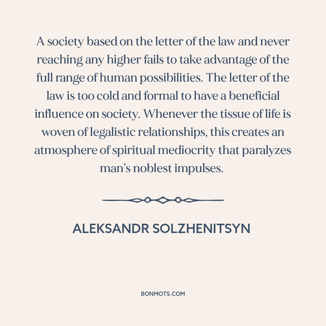 A society based on the letter of the law and never reaching any higher fails to take advantage of the full range of human possibilities. The letter of the law is too cold and formal to have a beneficial influence on society. Whenever the tissue of life is woven of legalistic relationships, this creates an atmosphere of spiritual mediocrity that paralyzes man’s noblest impulses.