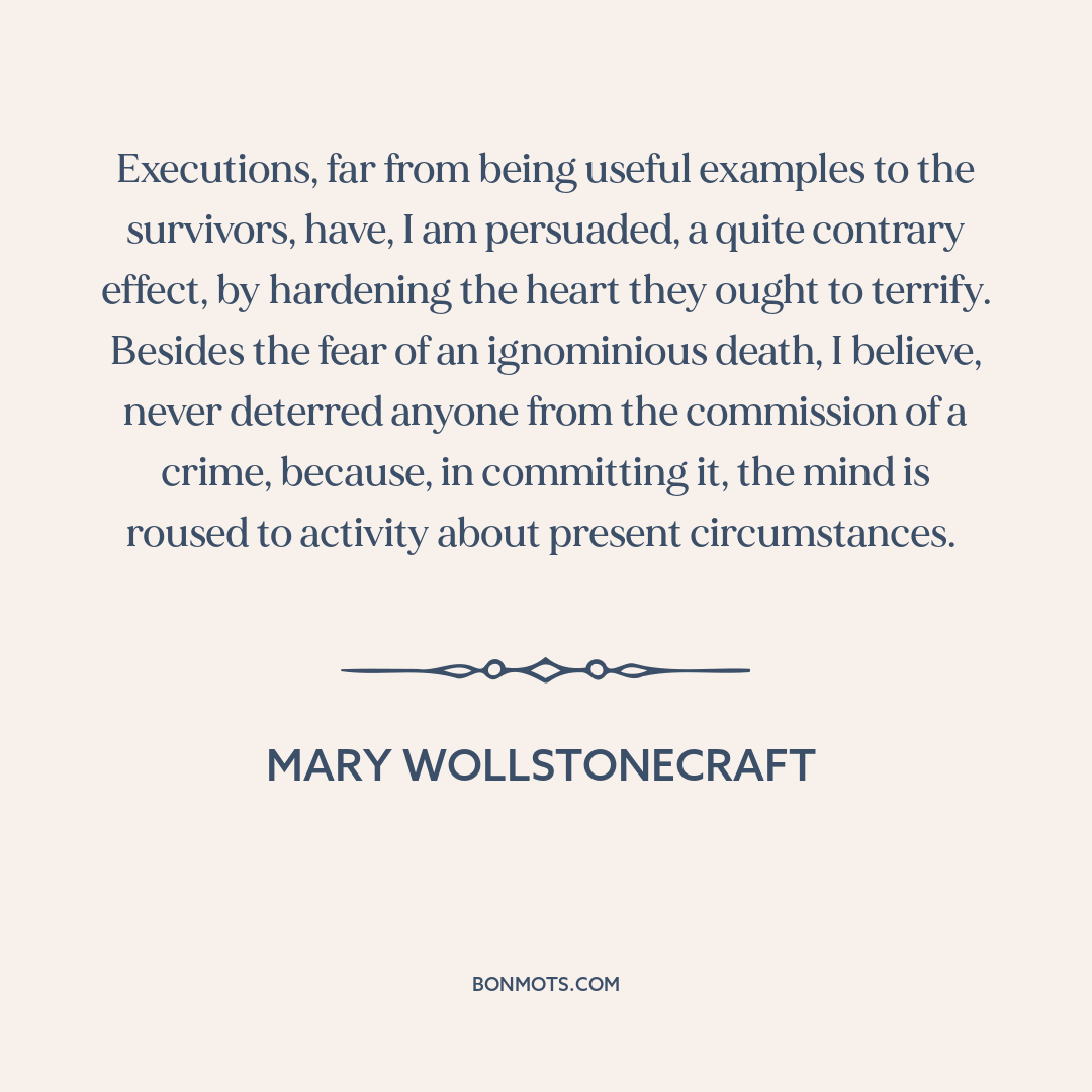 Executions, far from being useful examples to the survivors, have, I am persuaded, a quite contrary effect, by hardening the heart they ought to terrify. Besides the fear of an ignominious death, I believe, never deterred anyone from the commission of a crime, because, in committing it, the mind is roused to activity about present circumstances.
