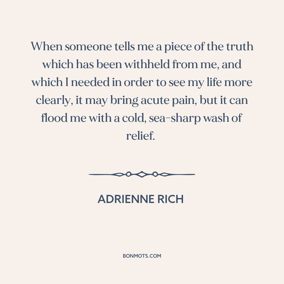 When someone tells me a piece of the truth which has been withheld from me, and which I needed in order to see my life more clearly, it may bring acute pain, but it can flood me with a cold, sea-sharp wash of relief.