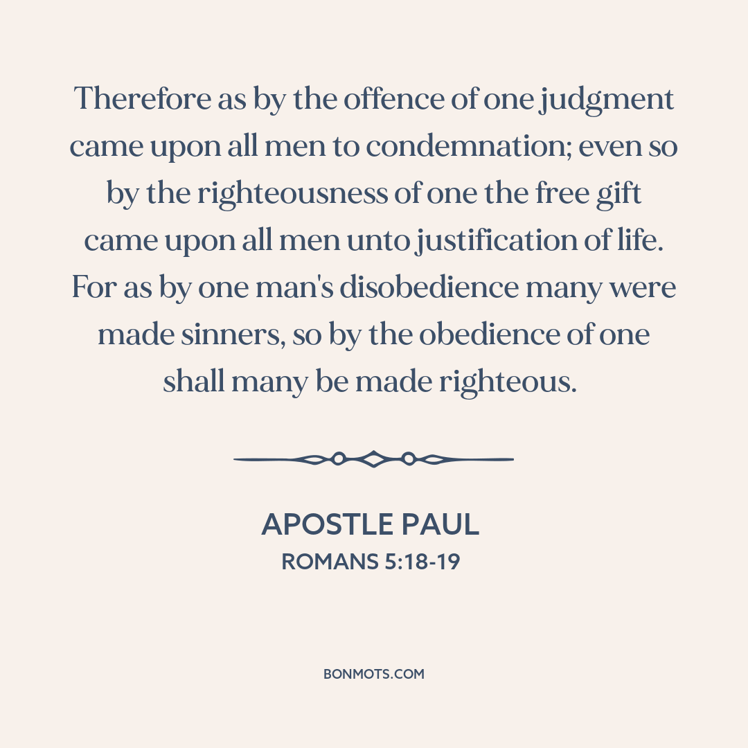 Therefore as by the offence of one judgment came upon all men to condemnation; even so by the righteousness of one the free gift came upon all men unto justification of life. For as by one man's disobedience many were made sinners, so by the obedience of one shall many be made righteous.