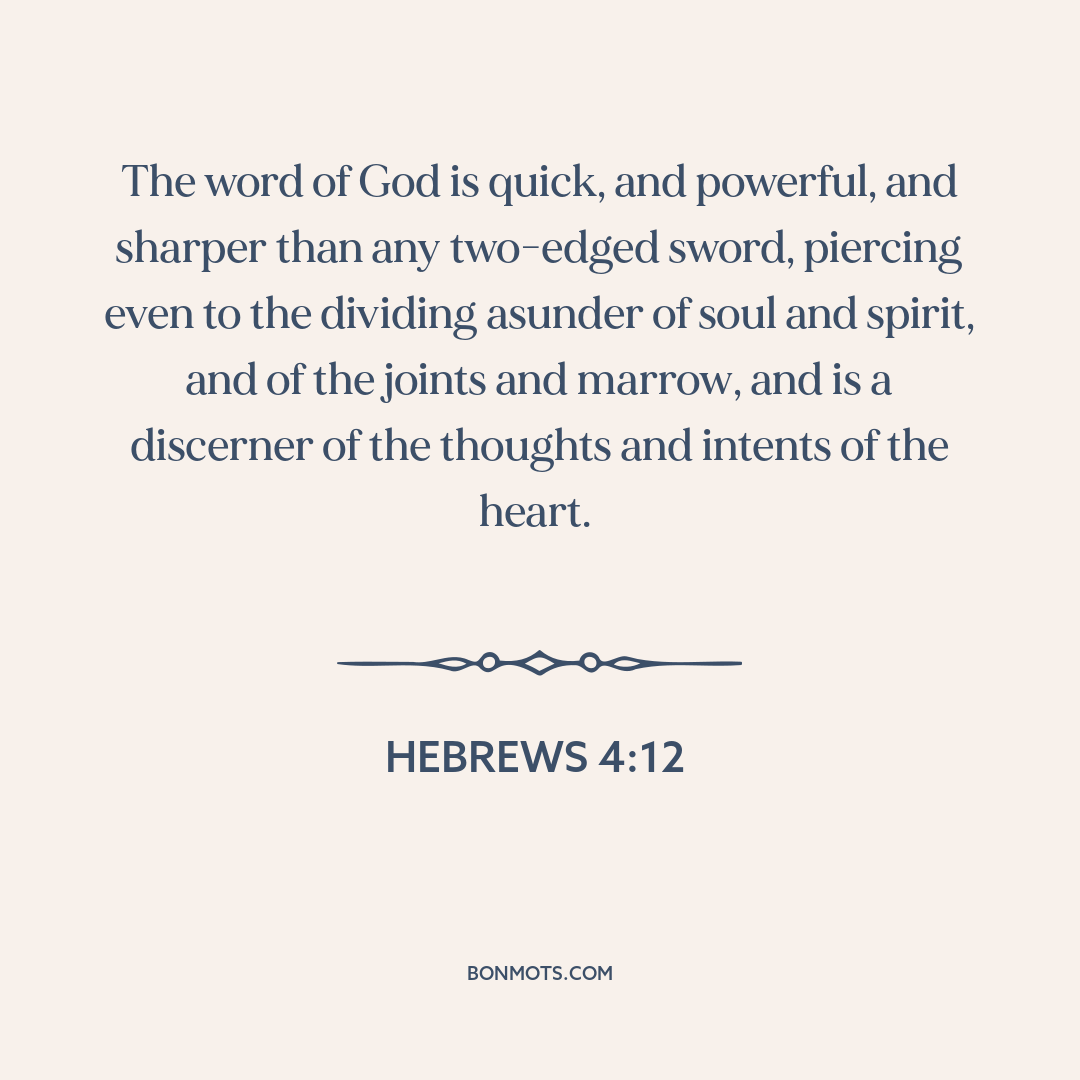 The word of God is quick, and powerful, and sharper than any two-edged sword, piercing even to the dividing asunder of soul and spirit, and of the joints and marrow, and is a discerner of the thoughts and intents of the heart.