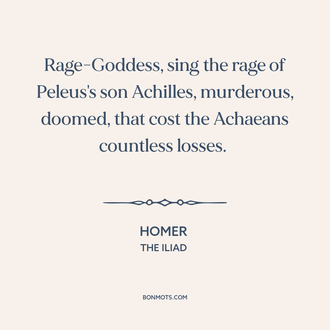 Rage-Goddess, sing the rage of Peleus's son Achilles, murderous, doomed, that cost the Achaeans countless losses.
