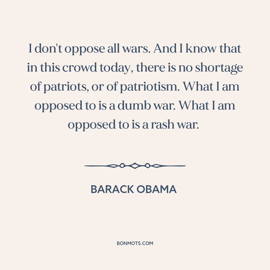 I don't oppose all wars. And I know that in this crowd today, there is no shortage of patriots, or of patriotism. What I am opposed to is a dumb war. What I am opposed to is a rash war.