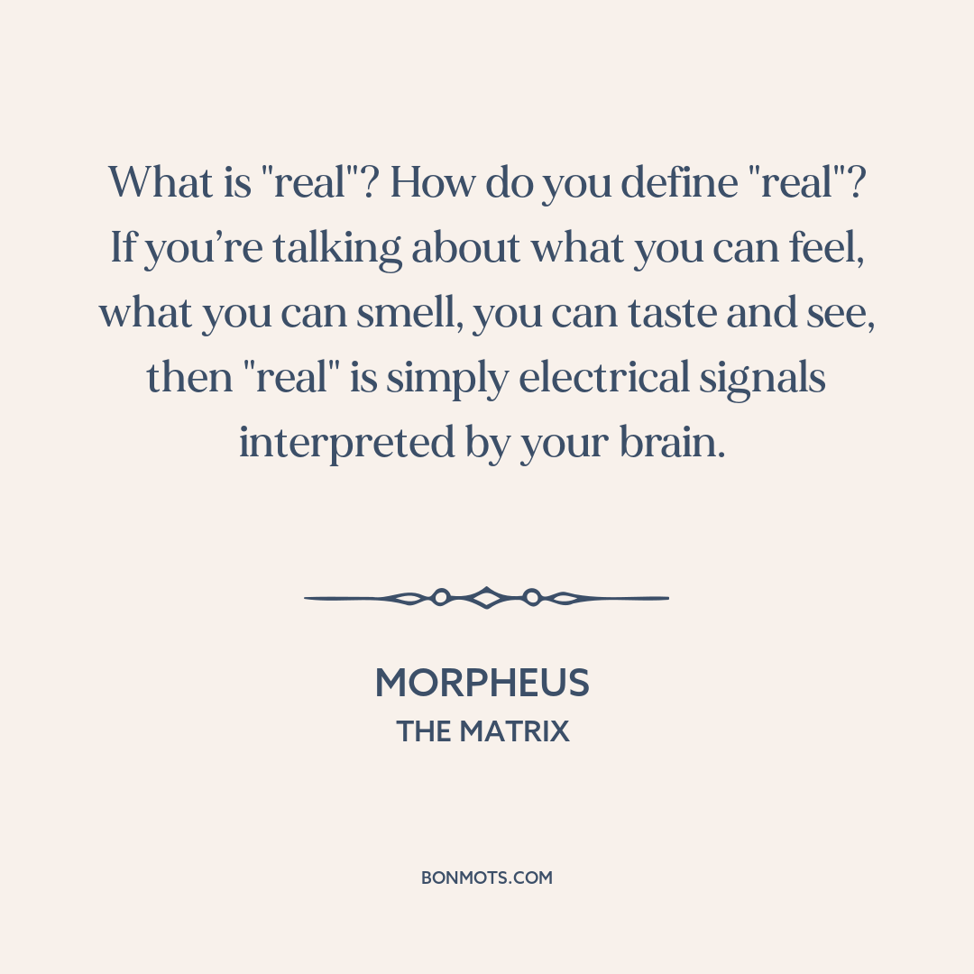 What is "real"? How do you define "real"? If you’re talking about what you can feel, what you can smell, you can taste and see, then "real" is simply electrical signals interpreted by your brain.