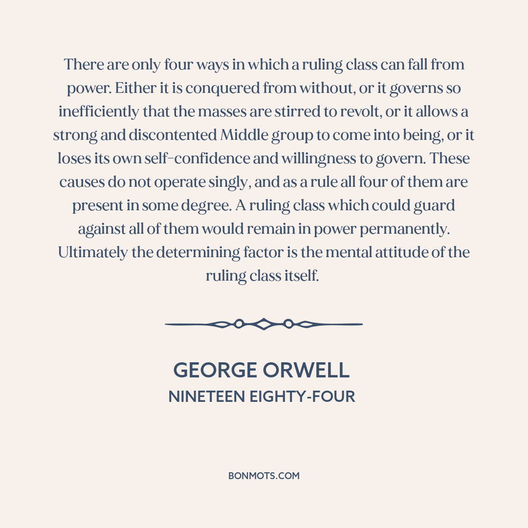 There are only four ways in which a ruling class can fall from power. Either it is conquered from without, or it governs so inefficiently that the masses are stirred to revolt, or it allows a strong and discontented Middle group to come into being, or it loses its own self-confidence and willingness to govern. These causes do not operate singly, and as a rule all four of them are present in some degree. A ruling class which could guard against all of them would remain in power permanently. Ultimately the determining factor is the mental attitude of the ruling class itself.