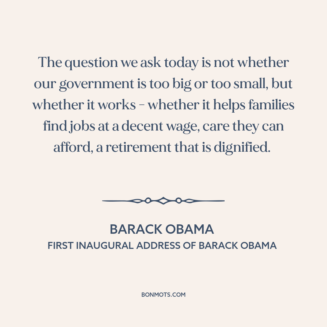 The question we ask today is not whether our government is too big or too small, but whether it works - whether it helps families find jobs at a decent wage, care they can afford, a retirement that is dignified.