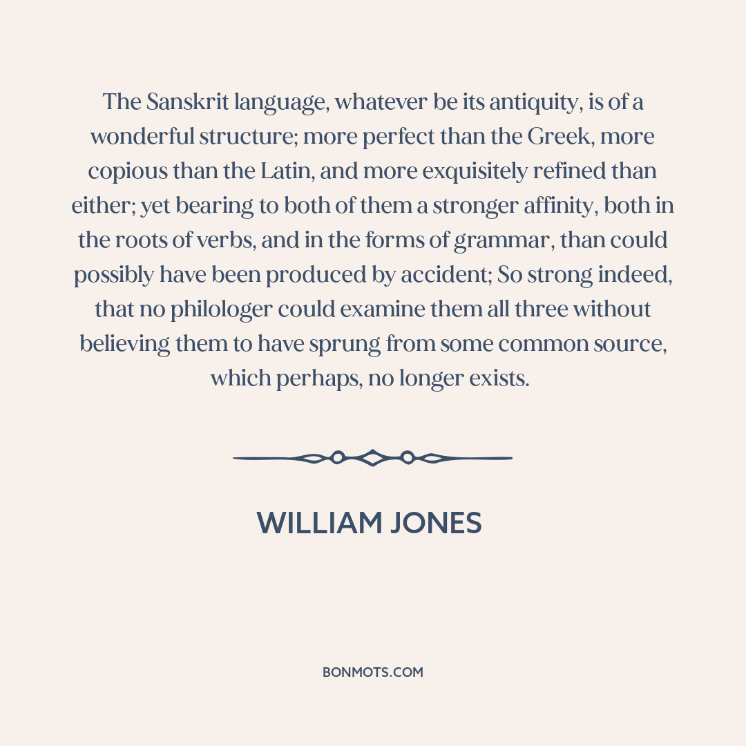 The Sanskrit language, whatever be its antiquity, is of a wonderful structure; more perfect than the Greek, more copious than the Latin, and more exquisitely refined than either; yet bearing to both of them a stronger affinity, both in the roots of verbs, and in the forms of grammar, than could possibly have been produced by accident; So strong indeed, that no philologer could examine them all three without believing them to have sprung from some common source, which perhaps, no longer exists.