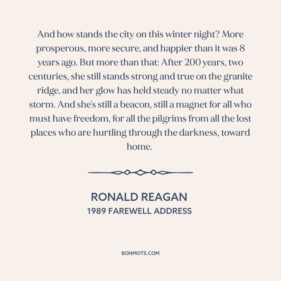And how stands the city on this winter night? More prosperous, more secure, and happier than it was 8 years ago. But more than that: After 200 years, two centuries, she still stands strong and true on the granite ridge, and her glow has held steady no matter what storm. And she's still a beacon, still a magnet for all who must have freedom, for all the pilgrims from all the lost places who are hurtling through the darkness, toward home.