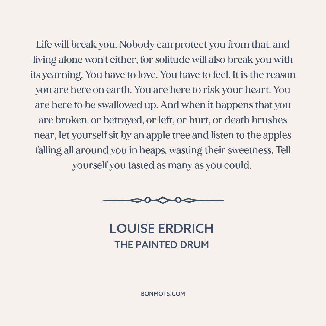 Life will break you. Nobody can protect you from that, and living alone won't either, for solitude will also break you with its yearning. You have to love. You have to feel. It is the reason you are here on earth. You are here to risk your heart. You are here to be swallowed up. And when it happens that you are broken, or betrayed, or left, or hurt, or death brushes near, let yourself sit by an apple tree and listen to the apples falling all around you in heaps, wasting their sweetness. Tell yourself you tasted as many as you could.