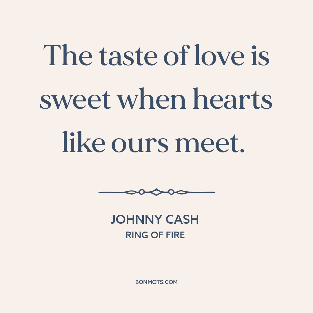 The taste of love is sweet when hearts like ours meet. Johnny Cash Ring of Fire Listen to Ring of Fire at Amazon Listen to Ring of Fire at Amazon Read the lyrics to Ring of Fire at genius.com Instagram sharing coming soon. Quote text and source copied to clipboard. Link to this quote copied to clipboard. More information about this quote Topic Being in love Love Speaker Johnny Cash Source Ring of Fire Medium Song Genre Country music Language English Time 1963 1960s 20th century Occupation Singer-songwriter Musician From United States Authentication Score 3 More information on Authentication Score coming soon. Citation Cash, June Carter and Merle Kilgore. "Ring of Fire." Performed by Johnny Cash. Ring of Fire: The Best of Johnny Cash. Columbia Nashville, 1963. Citation text copied to clipboard.