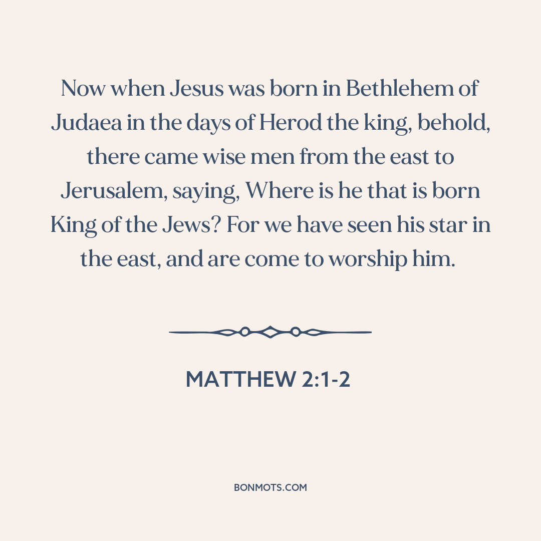 ἐν Βηθλέεμ τῆς Ἰουδαίας ἐν ἡμέραις Ἡρῴδου τοῦ βασιλέως, ἰδοὺ μάγοι ἀπὸ ἀνατολῶν παρεγένοντο εἰς Ἱεροσόλυμα λέγοντες Ποῦ ἐστιν ὁ τεχθεὶς βασιλεὺς τῶν Ἰουδαίων; εἴδομεν γὰρ αὐτοῦ τὸν ἀστέρα ἐν τῇ ἀνατολῇ καὶ ἤλθομεν προσκυνῆσαι αὐτῷ.