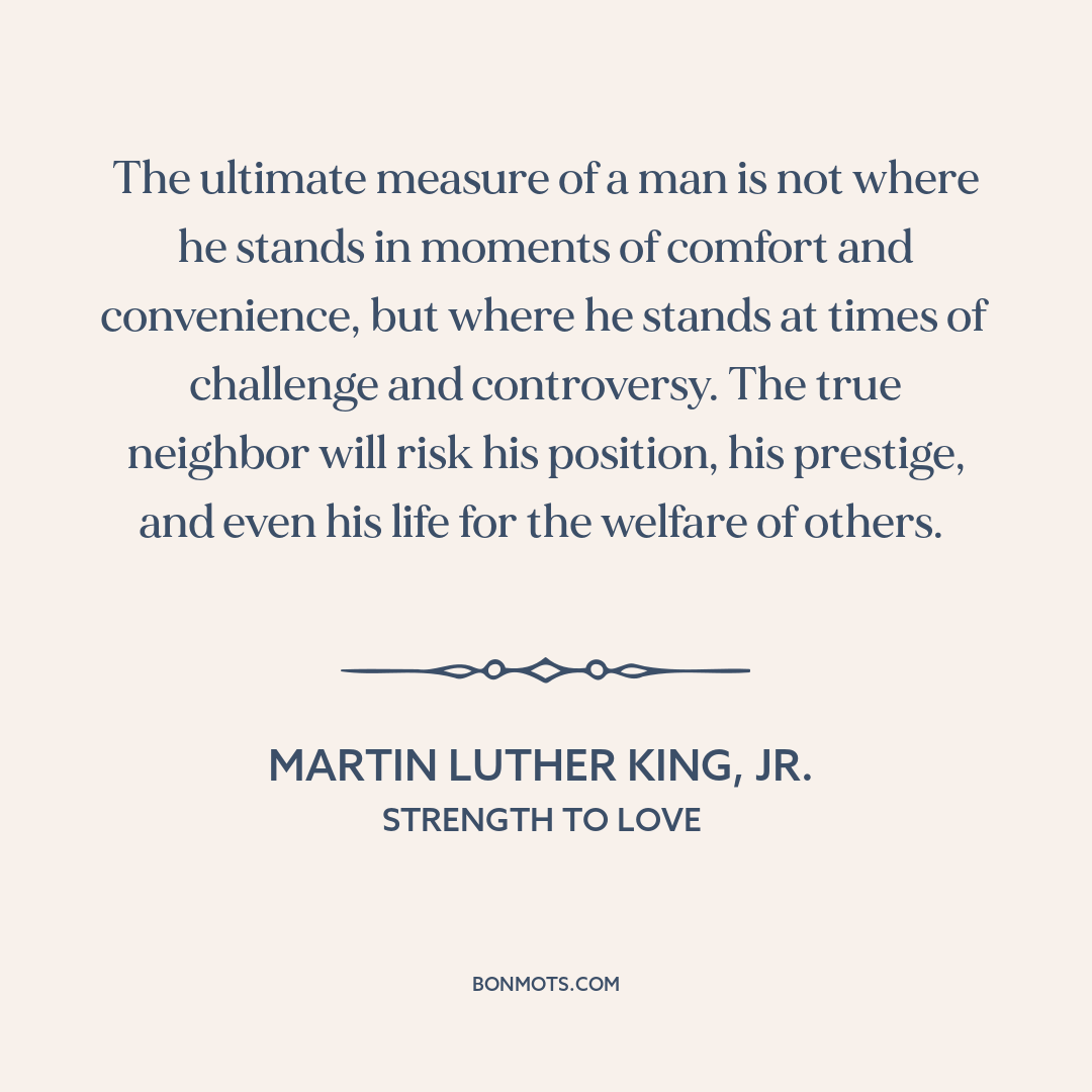 The ultimate measure of a man is not where he stands in moments of comfort and convenience, but where he stands at times of challenge and controversy. The true neighbor will risk his position, his prestige, and even his life for the welfare of others.