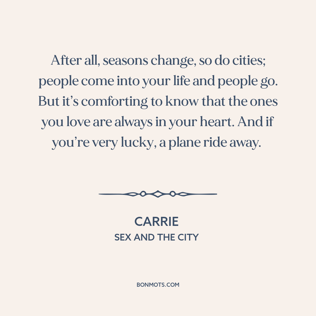 After all, seasons change, so do cities; people come into your life and people go. But it’s comforting to know that the ones you love are always in your heart. And if you’re very lucky, a plane ride away.
