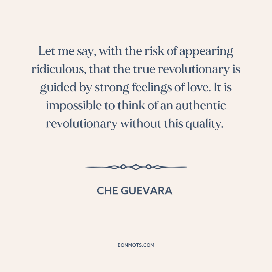 Let me say, with the risk of appearing ridiculous, that the true revolutionary is guided by strong feelings of love. It is impossible to think of an authentic revolutionary without this quality.