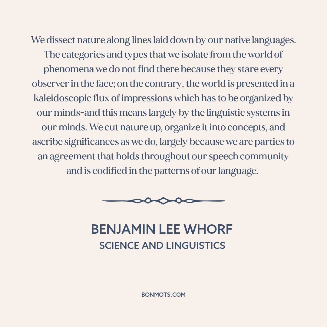 We dissect nature along lines laid down by our native languages. The categories and types that we isolate from the world of phenomena we do not find there because they stare every observer in the face; on the contrary, the world is presented in a kaleidoscopic flux of impressions which has to be organized by our minds-and this means largely by the linguistic systems in our minds. We cut nature up, organize it into concepts, and ascribe significances as we do, largely because we are parties to an agreement that holds throughout our speech community and is codified in the patterns of our language.