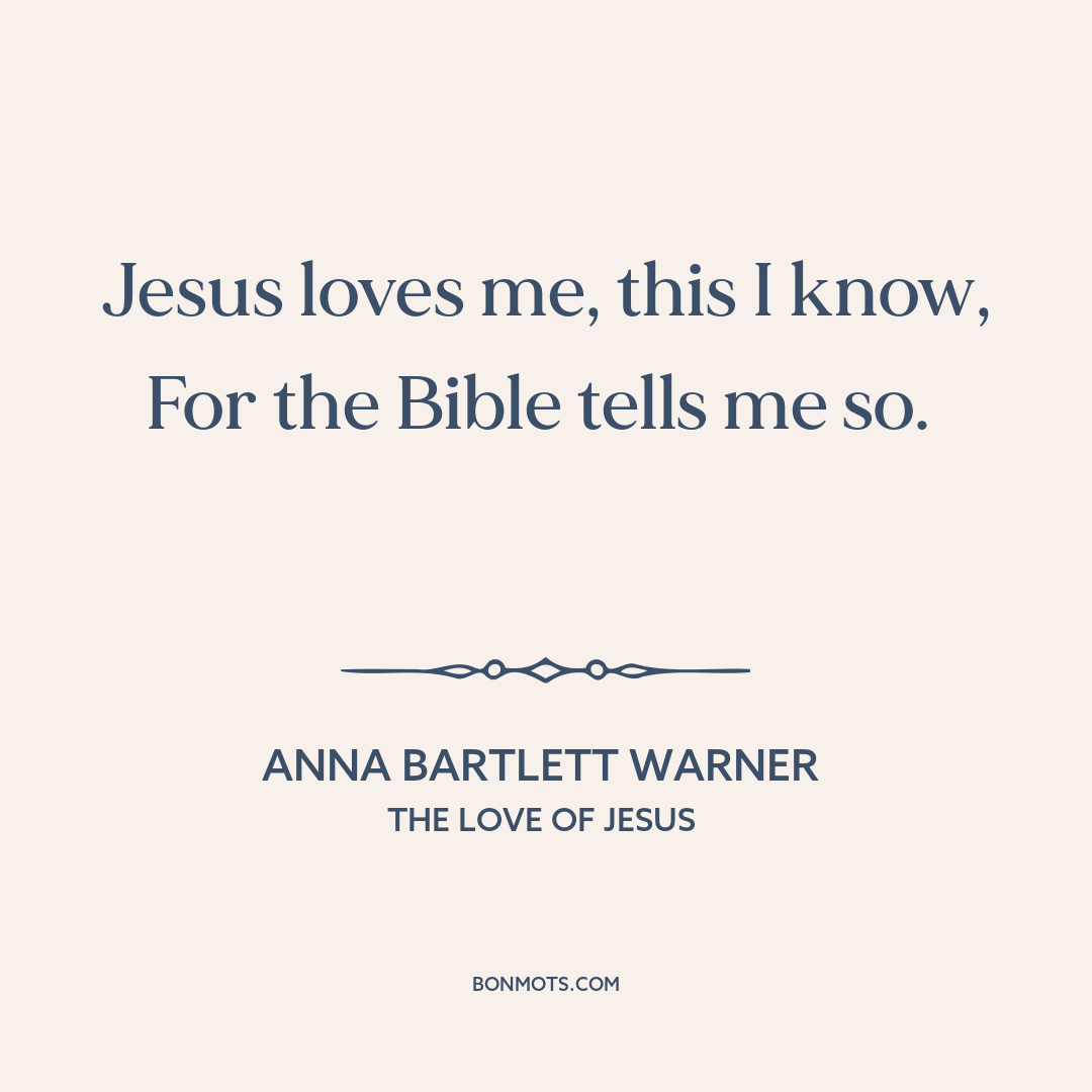 Warner, Anna Bartlett. Quoted in "Jesus Loves Me, This I Know." Say and Seal, written by Susan Warner. Philadelphia: J. B. Lippincott & Company, 1860.