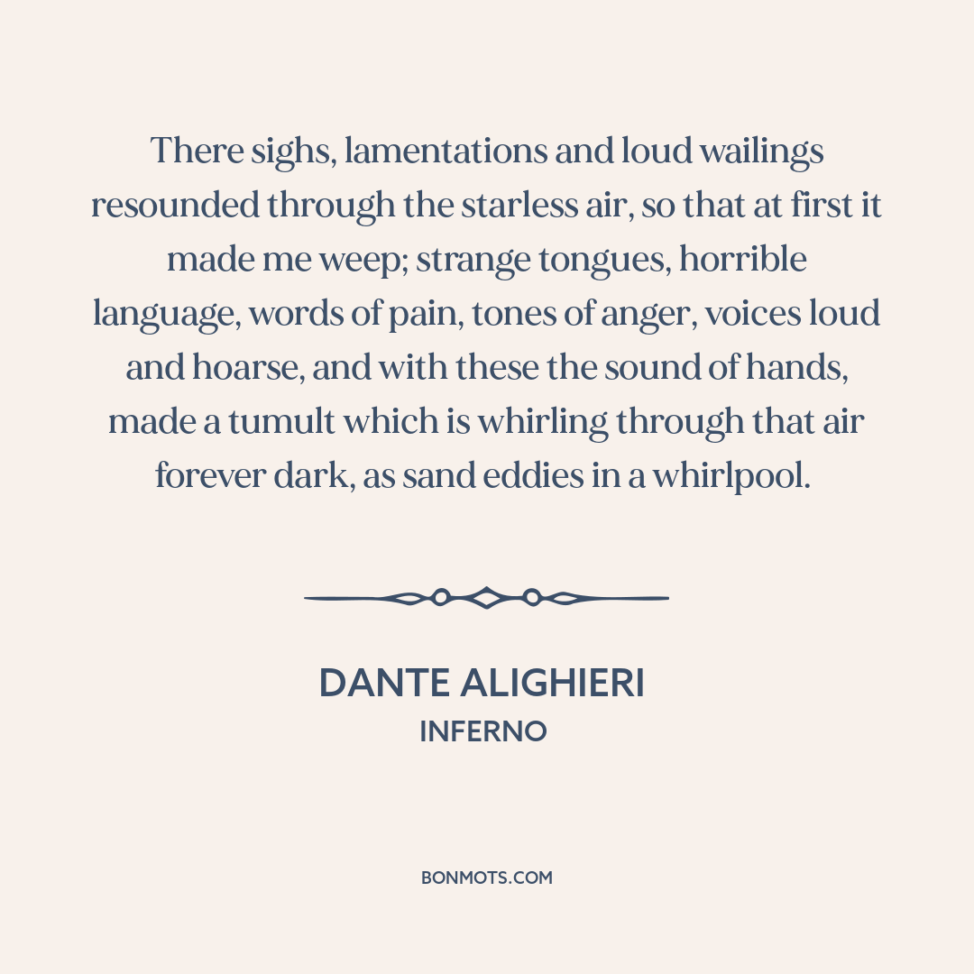 There sighs, lamentations and loud wailings resounded through the starless air, so that at first it made me weep; strange tongues, horrible language, words of pain, tones of anger, voices loud and hoarse, and with these the sound of hands, made a tumult which is whirling through that air forever dark, as sand eddies in a whirlpool.
