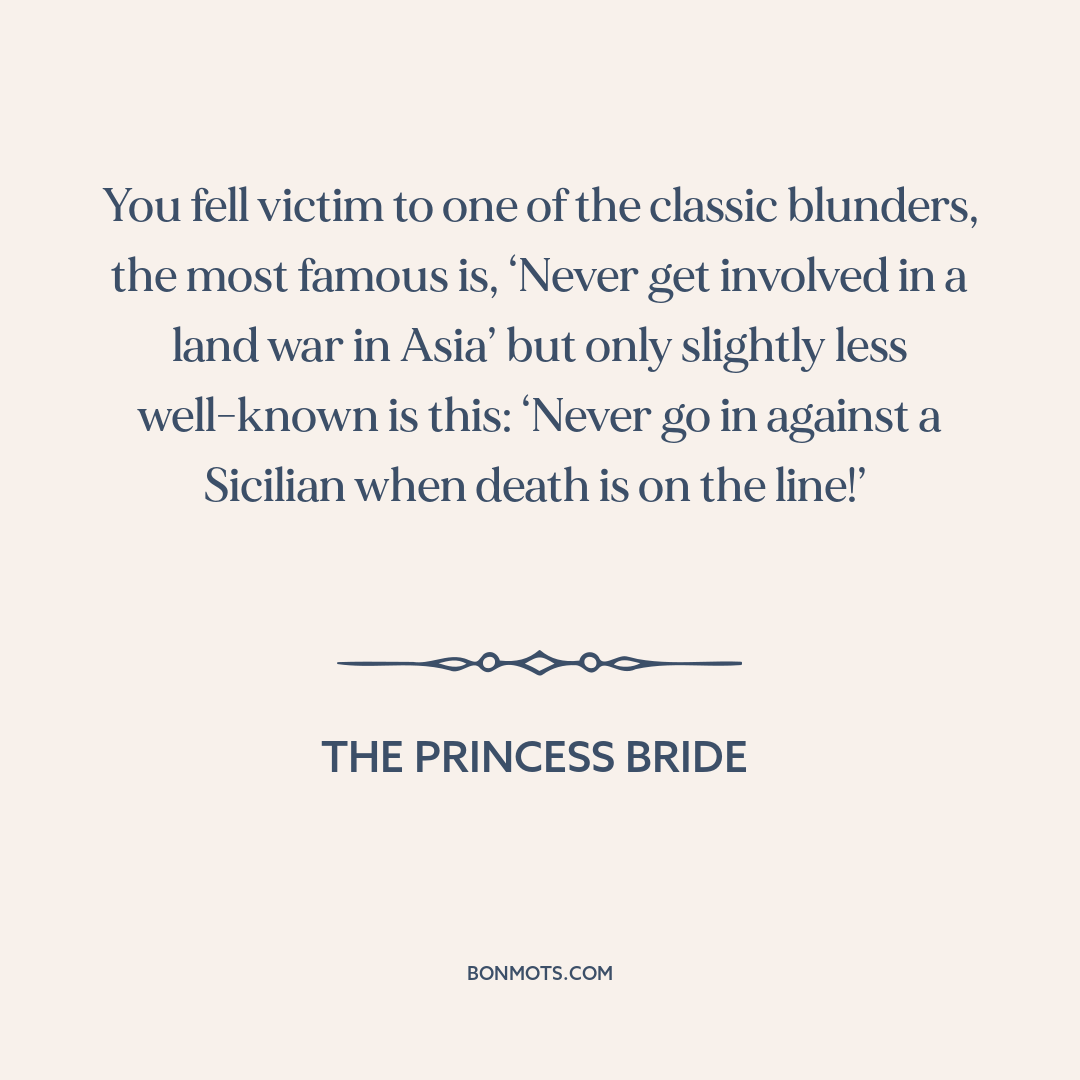 You fell victim to one of the classic blunders, the most famous is, ‘Never get involved in a land war in Asia’ but only slightly less well-known is this: ‘Never go in against a Sicilian when death is on the line!’