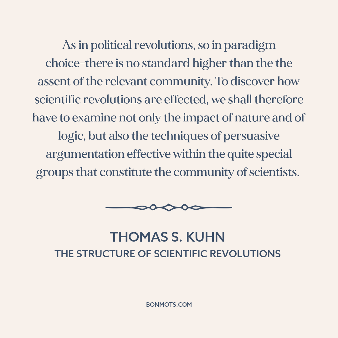 As in political revolutions, so in paradigm choice-there is no standard higher than the the assent of the relevant community. To discover how scientific revolutions are effected, we shall therefore have to examine not only the impact of nature and of logic, but also the techniques of persuasive argumentation effective within the quite special groups that constitute the community of scientists.