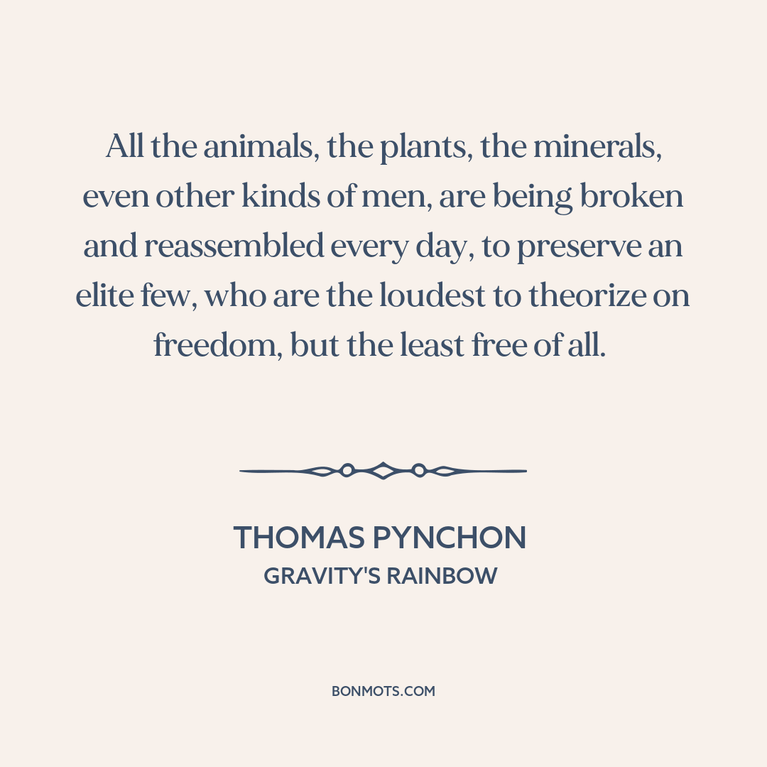 All the animals, the plants, the minerals, even other kinds of men, are being broken and reassembled every day, to preserve an elite few, who are the loudest to theorize on freedom, but the least free of all.
