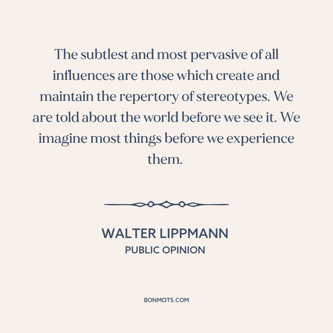 The subtlest and most pervasive of all influences are those which create and maintain the repertory of stereotypes. We are told about the world before we see it. We imagine most things before we experience them.