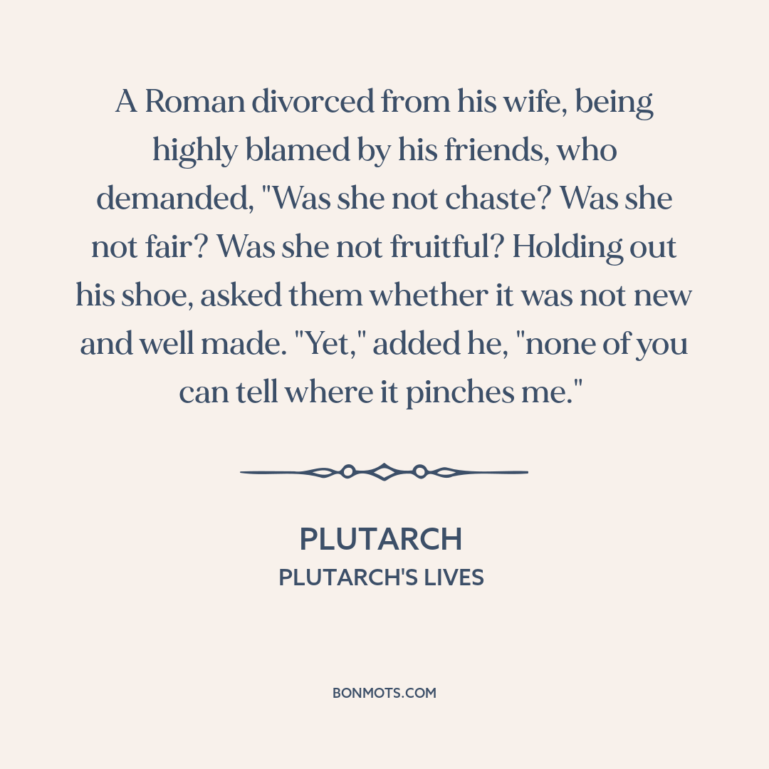 A Roman divorced from his wife, being highly blamed by his friends, who demanded, "Was she not chaste? Was she not fair? Was she not fruitful? Holding out his shoe, asked them whether it was not new and well made. "Yet," added he, "none of you can tell where it pinches me."