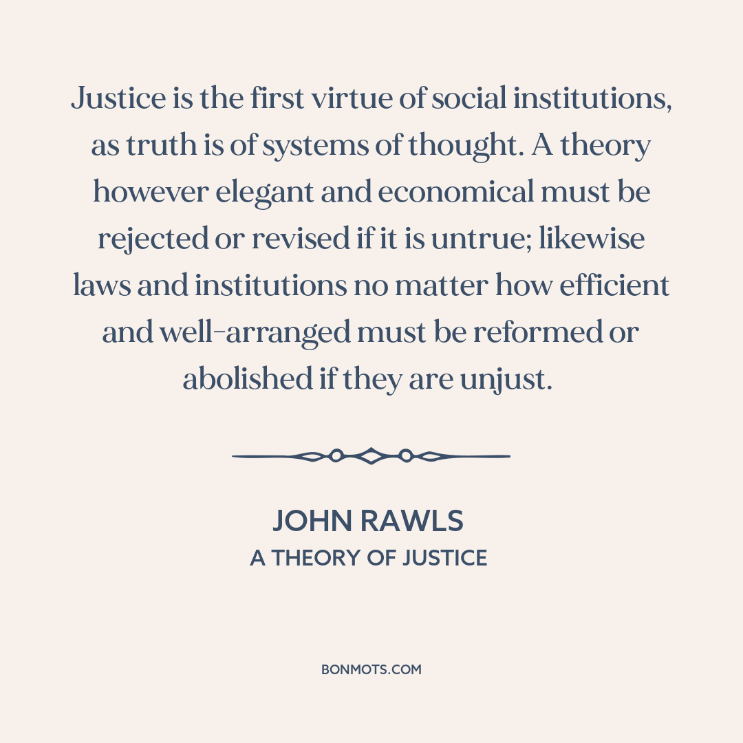 Justice is the first virtue of social institutions, as truth is of systems of thought. A theory however elegant and economical must be rejected or revised if it is untrue; likewise laws and institutions no matter how efficient and well-arranged must be reformed or abolished if they are unjust.