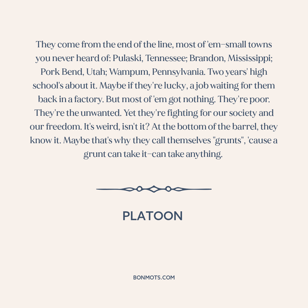 They come from the end of the line, most of 'em—small towns you never heard of: Pulaski, Tennessee; Brandon, Mississippi; Pork Bend, Utah; Wampum, Pennsylvania. Two years' high school's about it. Maybe if they're lucky, a job waiting for them back in a factory. But most of 'em got nothing. They're poor. They're the unwanted. Yet they're fighting for our society and our freedom. It's weird, isn't it? At the bottom of the barrel, they know it. Maybe that's why they call themselves "grunts", 'cause a grunt can take it—can take anything.