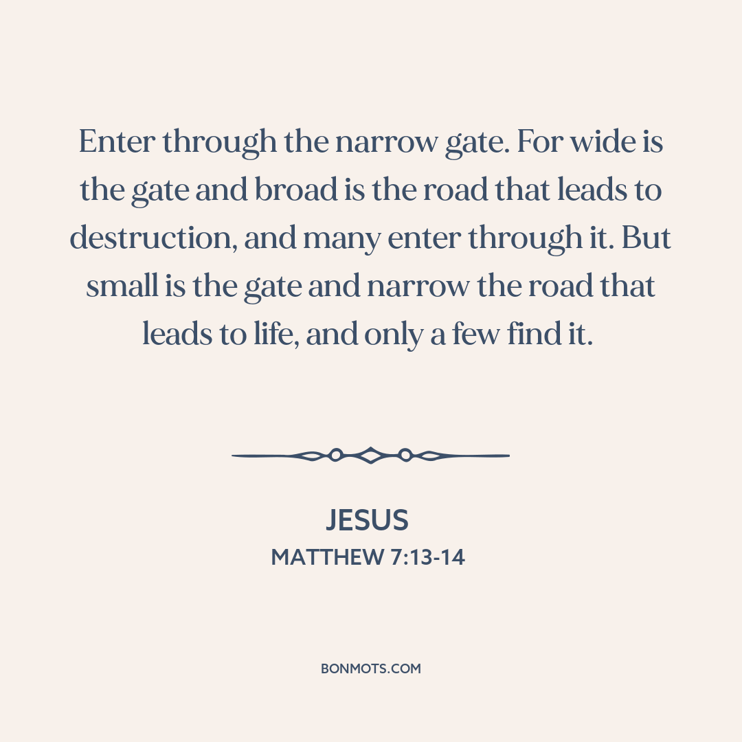 Enter through the narrow gate. For wide is the gate and broad is the road that leads to destruction, and many enter through it. But small is the gate and narrow the road that leads to life, and only a few find it.