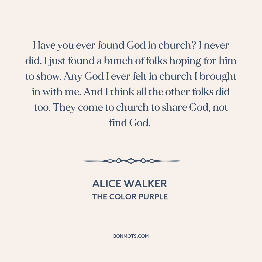 Have you ever found God in church? I never did. I just found a bunch of folks hoping for him to show. Any God I ever felt in church I brought in with me. And I think all the other folks did too. They come to church to share God, not find God.