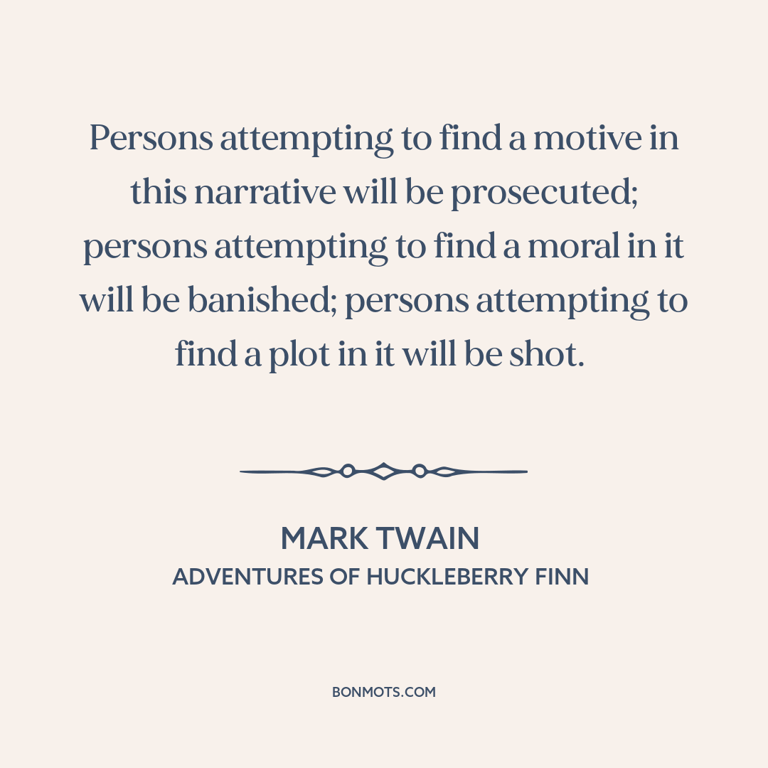 Persons attempting to find a motive in this narrative will be prosecuted; persons attempting to find a moral in it will be banished; persons attempting to find a plot in it will be shot.
